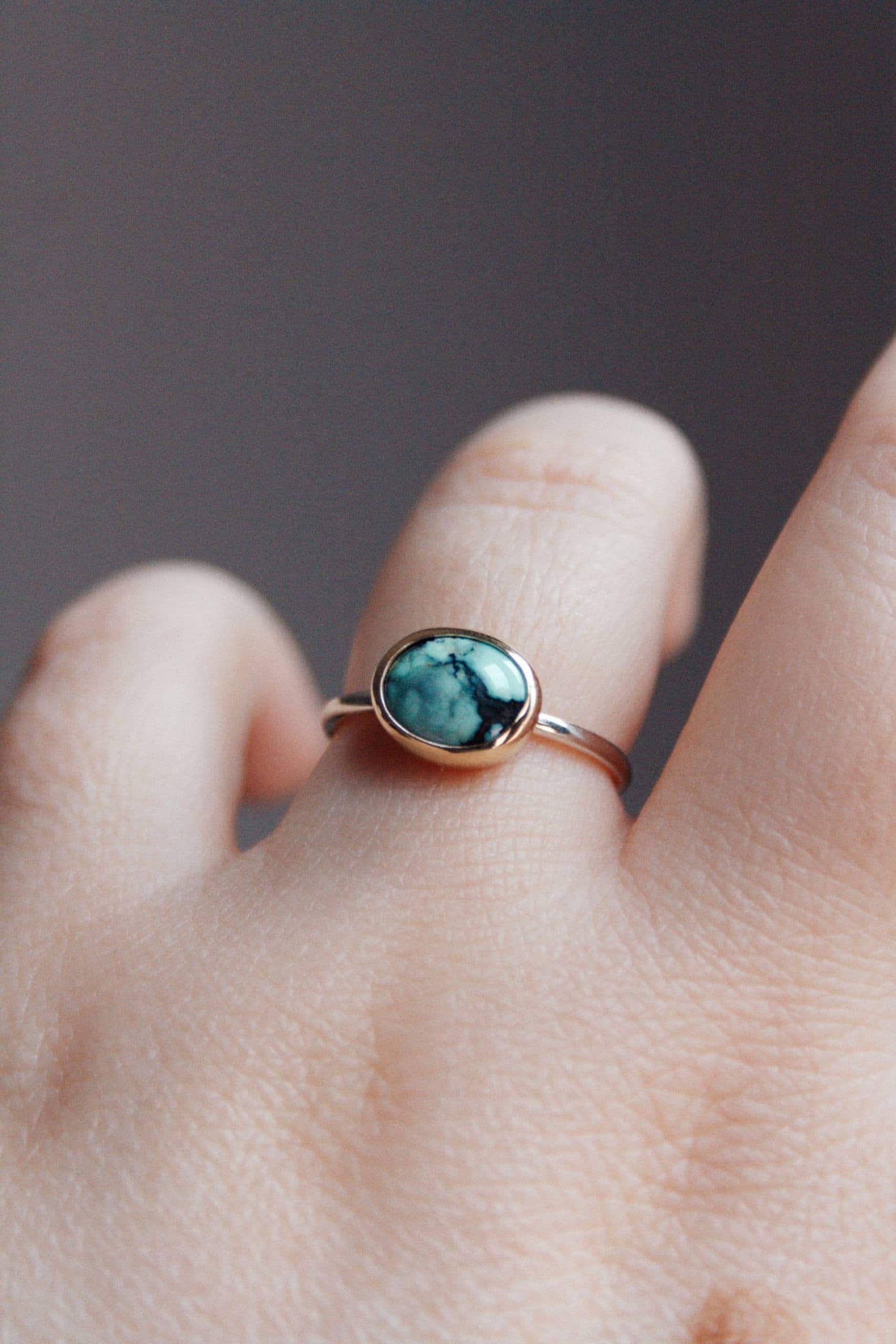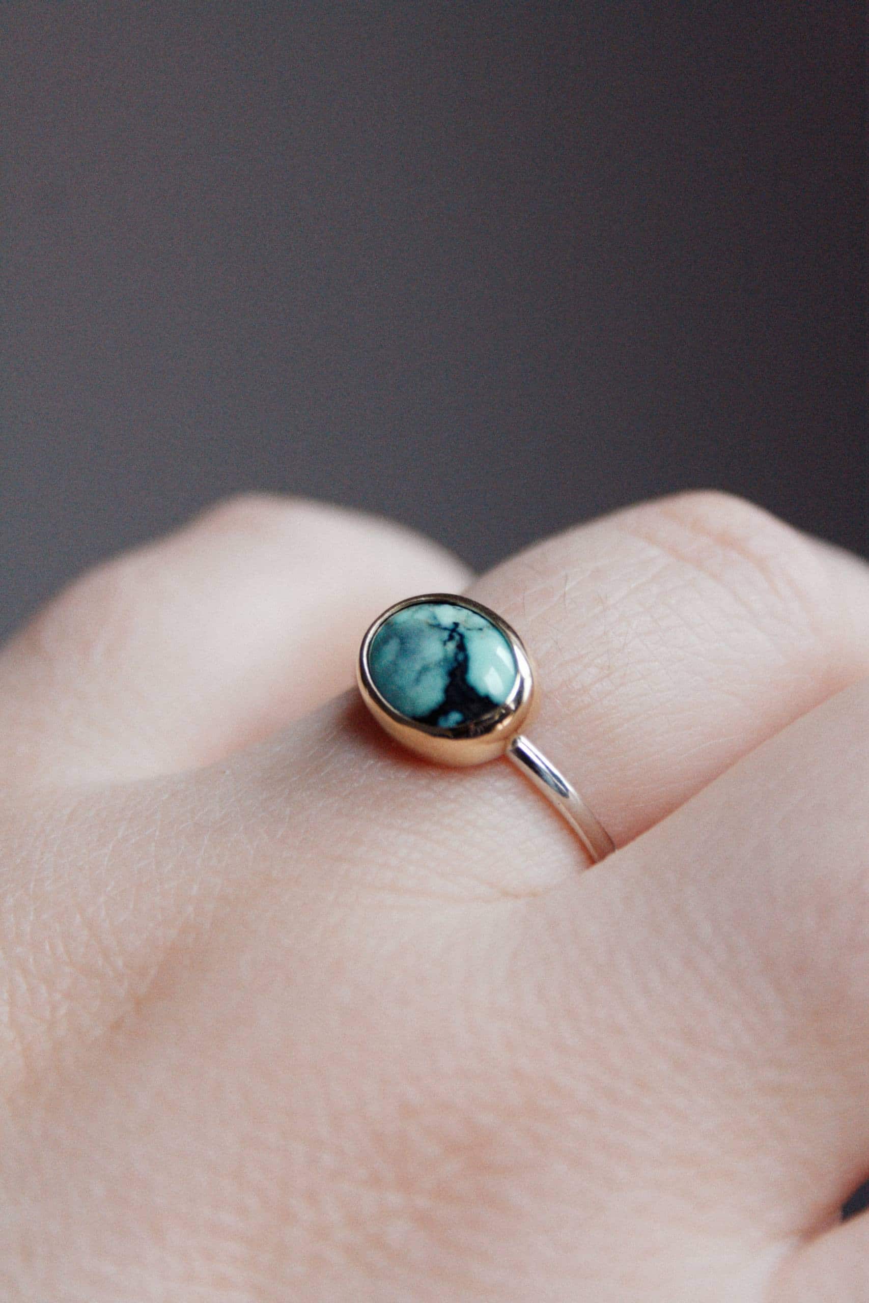 Anillo hecho de plata y oro sólido de 9k. El aro del anillo es de plata y el bisel de oro. Calcosiderita de alta calidad. Es talla 13.5 pero puedo agrandarlo hasta dos tallas. Si necesitas hacerlo, déjame tu talla en la cajita de comentarios al hacer tu pedido.